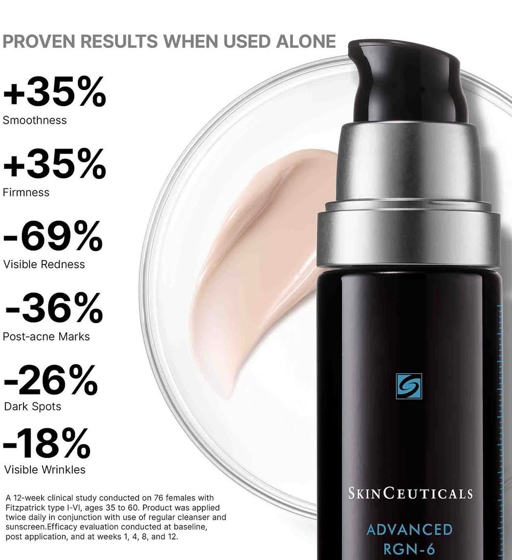 Advanced RGN-6 is a regenerative cream to visibly reverse 6 signs of aging and skin tone damage. Inspired by laser regeneration science, this patented formula is designed to be paired with in office laser procedures, or alone as part of a daily skincare routine.