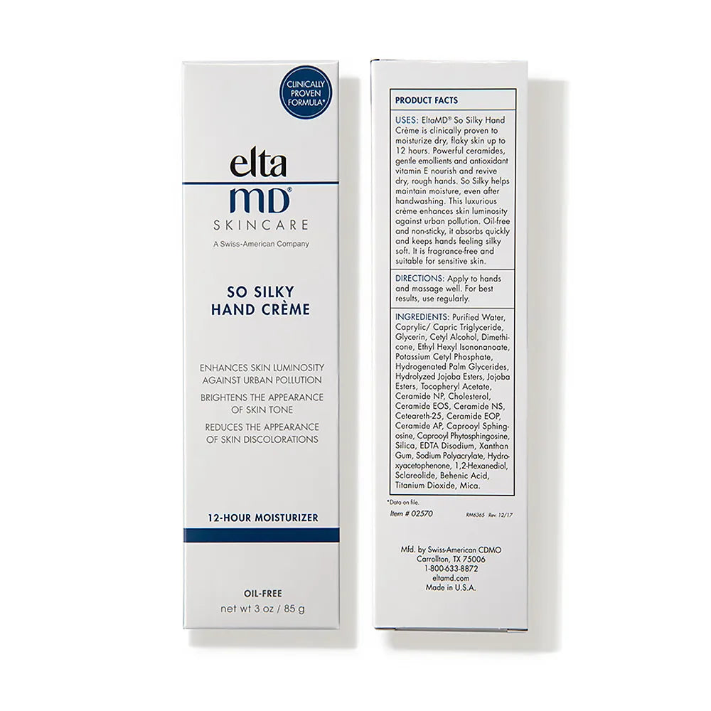EltaMD So Silky Hand Crème is clinically proven to moisturize dry, flaky skin up to 12 hours. Powerful ceramides, gentle emollients and antioxidant vitamin E nourish and revive dry, rough hands.