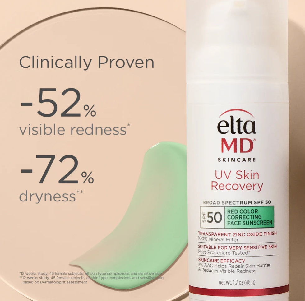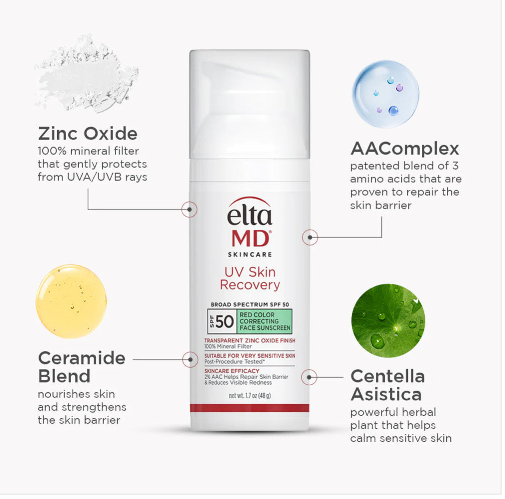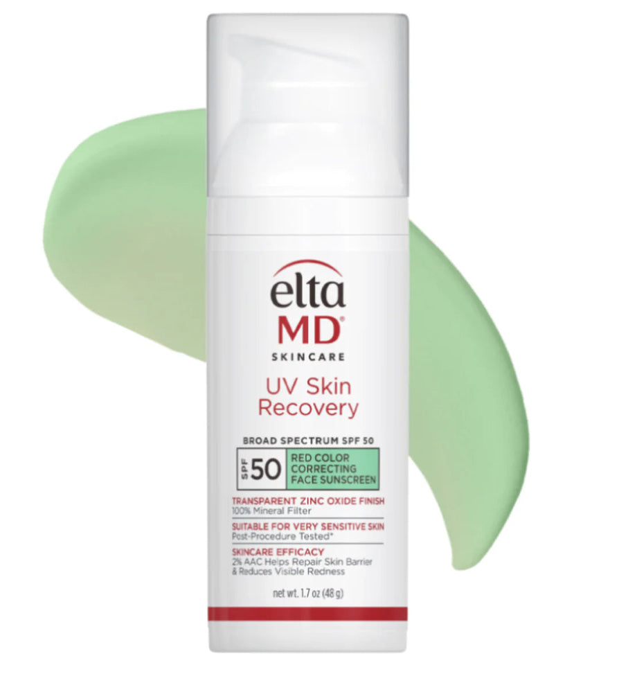 Introducing EltaMD UV Skin Recovery, a 100% mineral sunscreen powered by patented 2% AA Complex Barrier Repair Technology to protect, recover, and strengthen even the most sensitive skin – like skin prone to rosacea. This lightweight, green-tinted formula instantly neutralizes redness with color-correcting technology while providing broad-spectrum protection with Zinc Oxide. Soothing Centella Asiatica and a nourishing Ceramide Blend work together to reinforce the skin barrier, minimizing future damage and sensitivity. Give your sensitive or post-procedure skin the superior protection it deserves while neutralizing any redness to reveal a healthy, more-even skin tone.(net wt 1.7 oz/48 g)